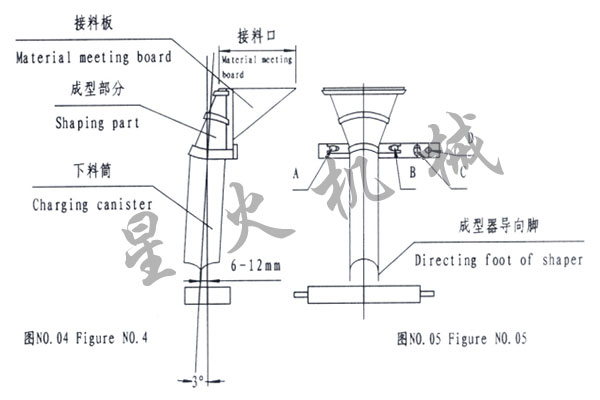 1、成型器的安裝如圖No.04, No.05成型器安裝參照圖No04, No.05標(biāo)準(zhǔn)。注意成型器須傾斜3度且導(dǎo)向腳與橫封封合線距離相差(6-12mm)。