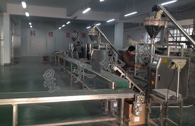 星火多臺組合粉劑包裝機在鄭州維達鑄造材料有限公司廠房中生產(chǎn)現(xiàn)場的身影