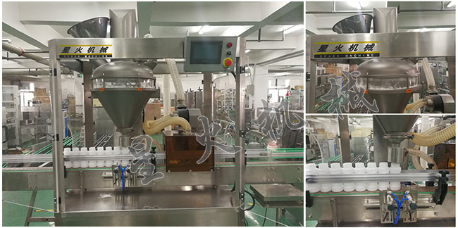 星火車間-粉劑瓶裝直線型自動灌裝機(jī)可選配自動封箱機(jī)、自動打包機(jī):