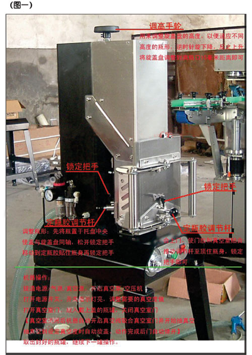 瓶高調(diào)整:轉(zhuǎn)動機器頂部手輪,逆時針旋蓋盤下降/反之上升,調(diào)整至瓶口(或蓋頂)離旋蓋盤下端膠墊平面約5-10毫米。